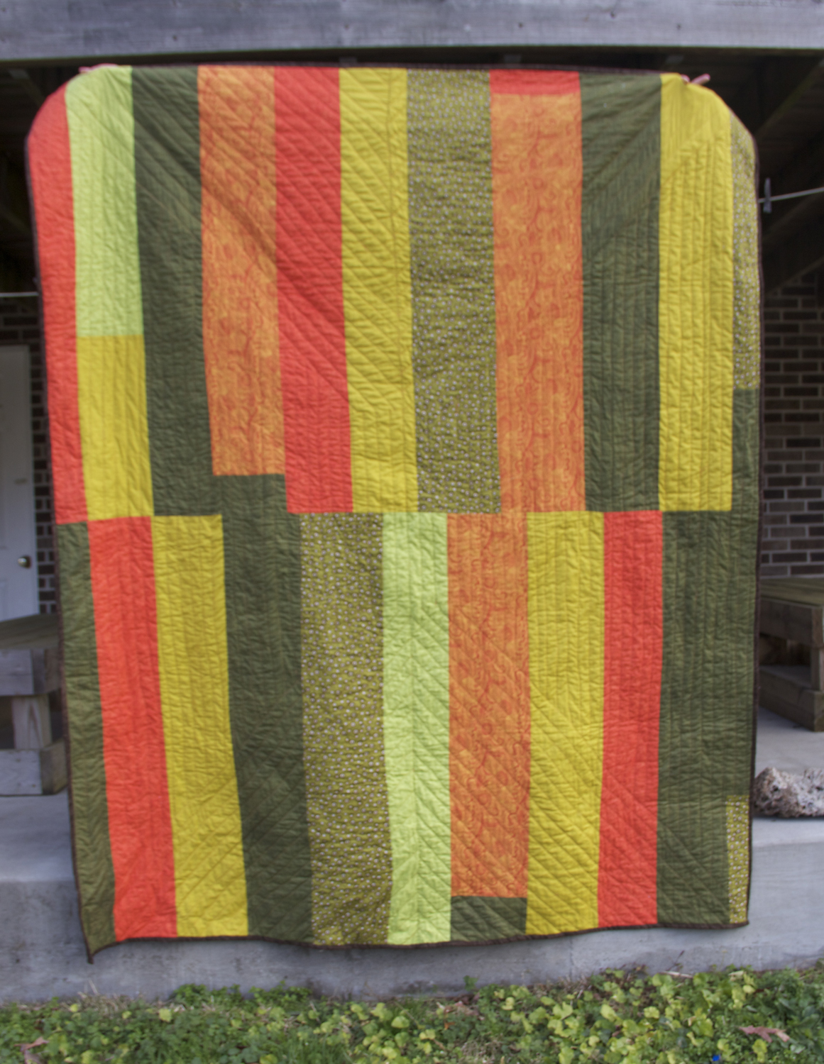 I love the big bold shapes in the Gee’s Bend quilts. I wanted to do something like that for Bob. My color choices came from the colors that are in his house. I took the same colors I used on the front and decided to do another configuration of rectangles on the back. I’m equally satisfied with both sides.