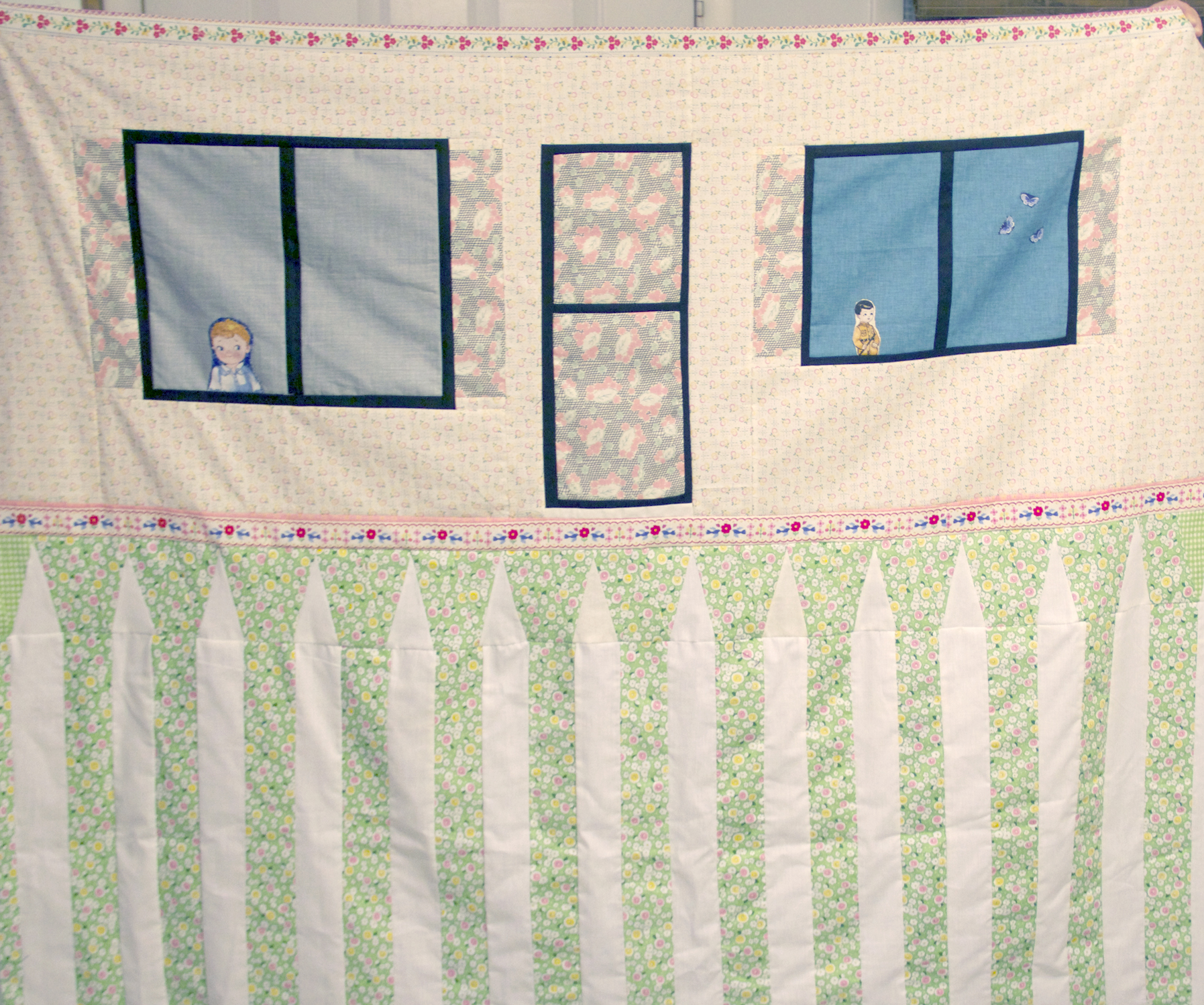 I didn’t have any time to sew yesterday. Didn’t have high hopes for today. I think the rain worked in my favor. I was able to get the first floor finished and sewn to the fence. I’m not happy with the proportions right now. I may cut a few inches off the fence. Going to wait till I have the second floor on. I like how this side of the quilt tells a narrative that goes with the other side. I might title this quilt, “A Story”.