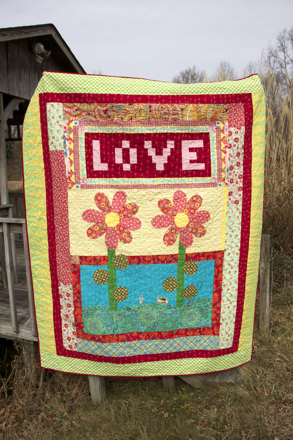 I finished this one today. A quilt becomes a part of you when you working on it. The front side is a narrative about Leslie. She is in a magic garden with her cat. It’s a garden where love grows. Her house is on the back of the quilt. She lives there with her family. Her husband Jonathan is looking at butterflies outside the window. Their son is also looking out at the world. Above them, Leslie stands in her studio window. She is finding inspiration for the art she makes in the attic.