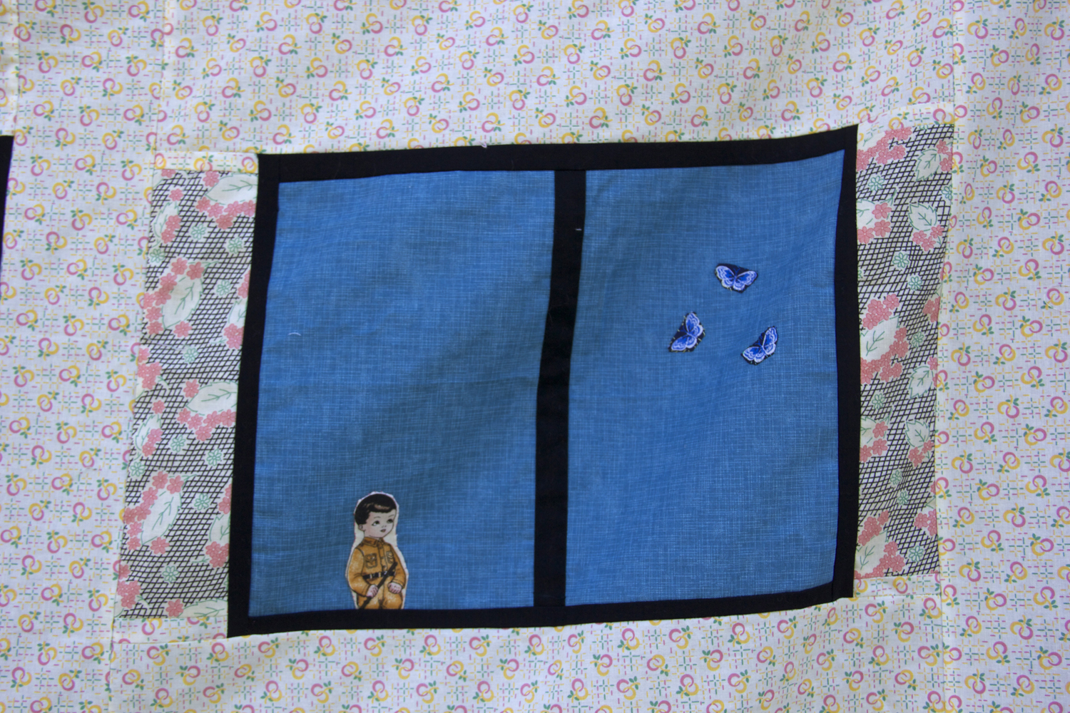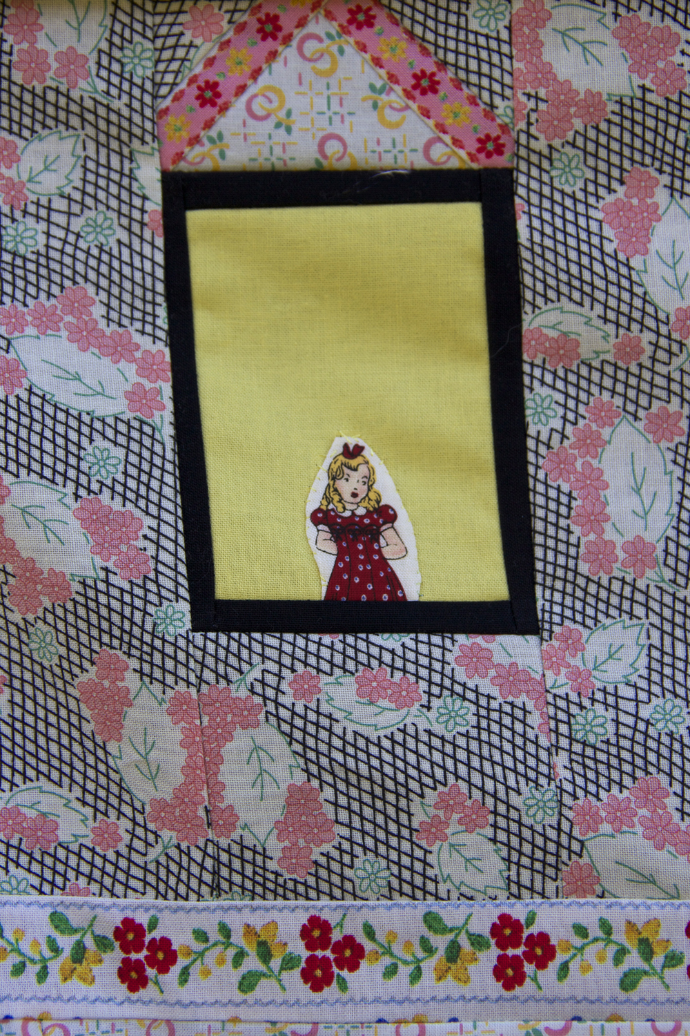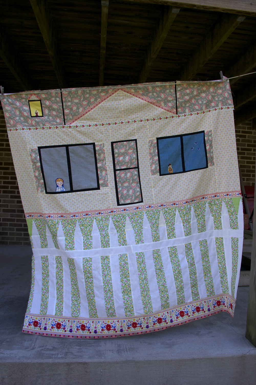 I finished this one today. A quilt becomes a part of you when you working on it. The front side is a narrative about Leslie. She is in a magic garden with her cat. It’s a garden where love grows. Her house is on the back of the quilt. She lives there with her family. Her husband Jonathan is looking at butterflies outside the window. Their son is also looking out at the world. Above them, Leslie stands in her studio window. She is finding inspiration for the art she makes in the attic.
